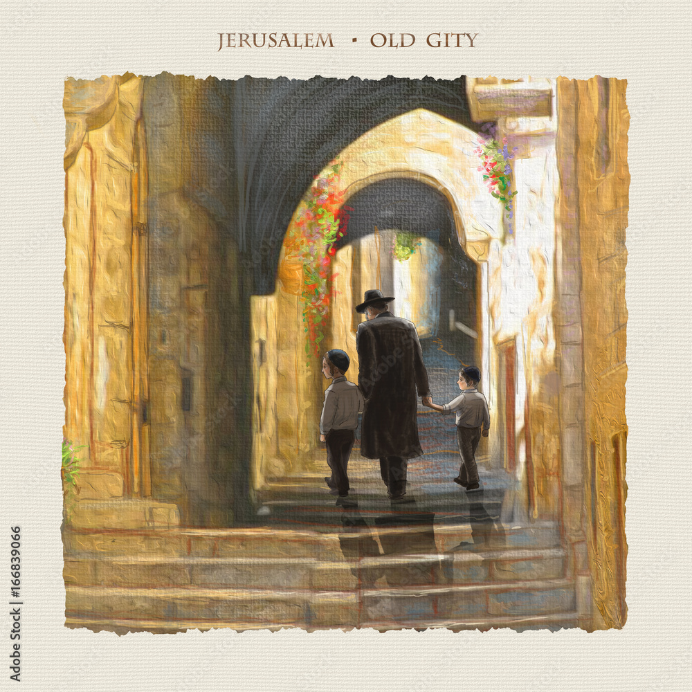 Jerusalem Old City Street Oil Painting Fine Art Hand Drawn Israel Jewish Holidays Jew Jewish Man Jewish Wedding Torah Judaism Bar Mitzvah Jewish Family Rosh Ha Shana Sukkot Passover Stock Illustration